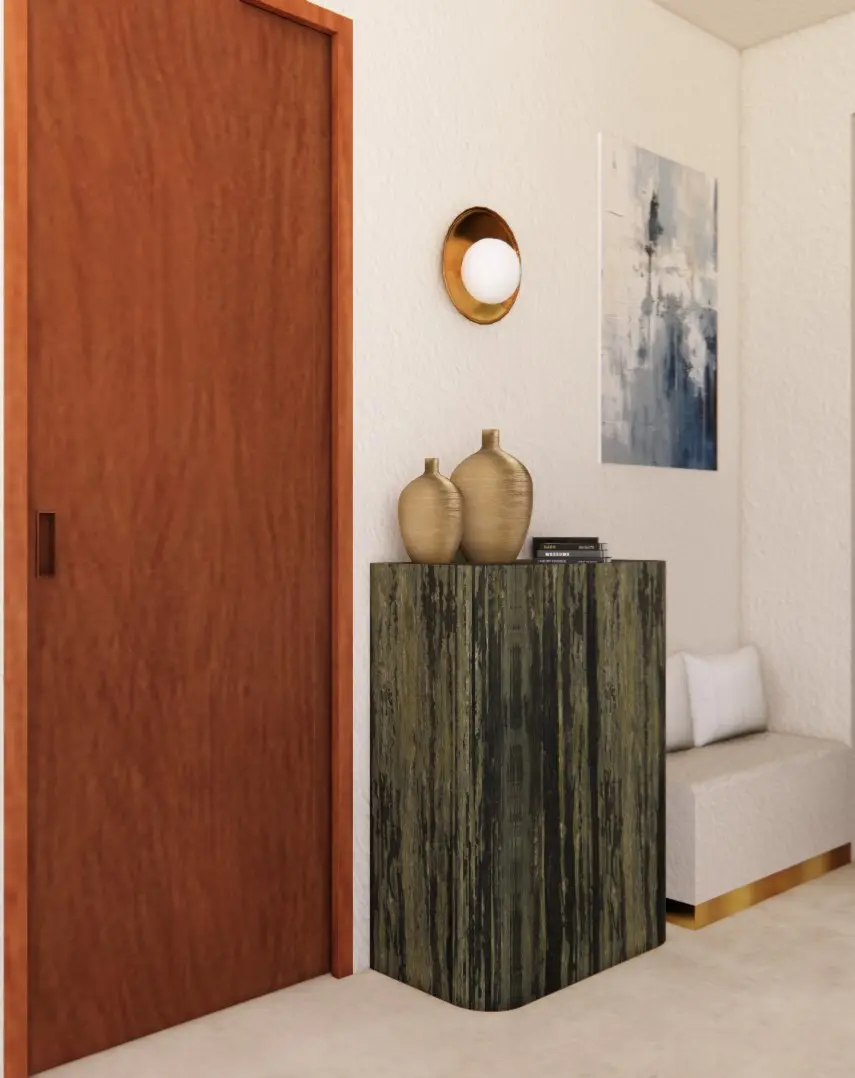 Chaque détail est soigneusement pensé pour créer une ambiance harmonieuse et apaisante. Le plumage en céramique de Botteganove, le tissu Autographe de chez Casamance et le buffet en quartzite vert bambou imprègnent chaque pièce de simplicité et de charme.